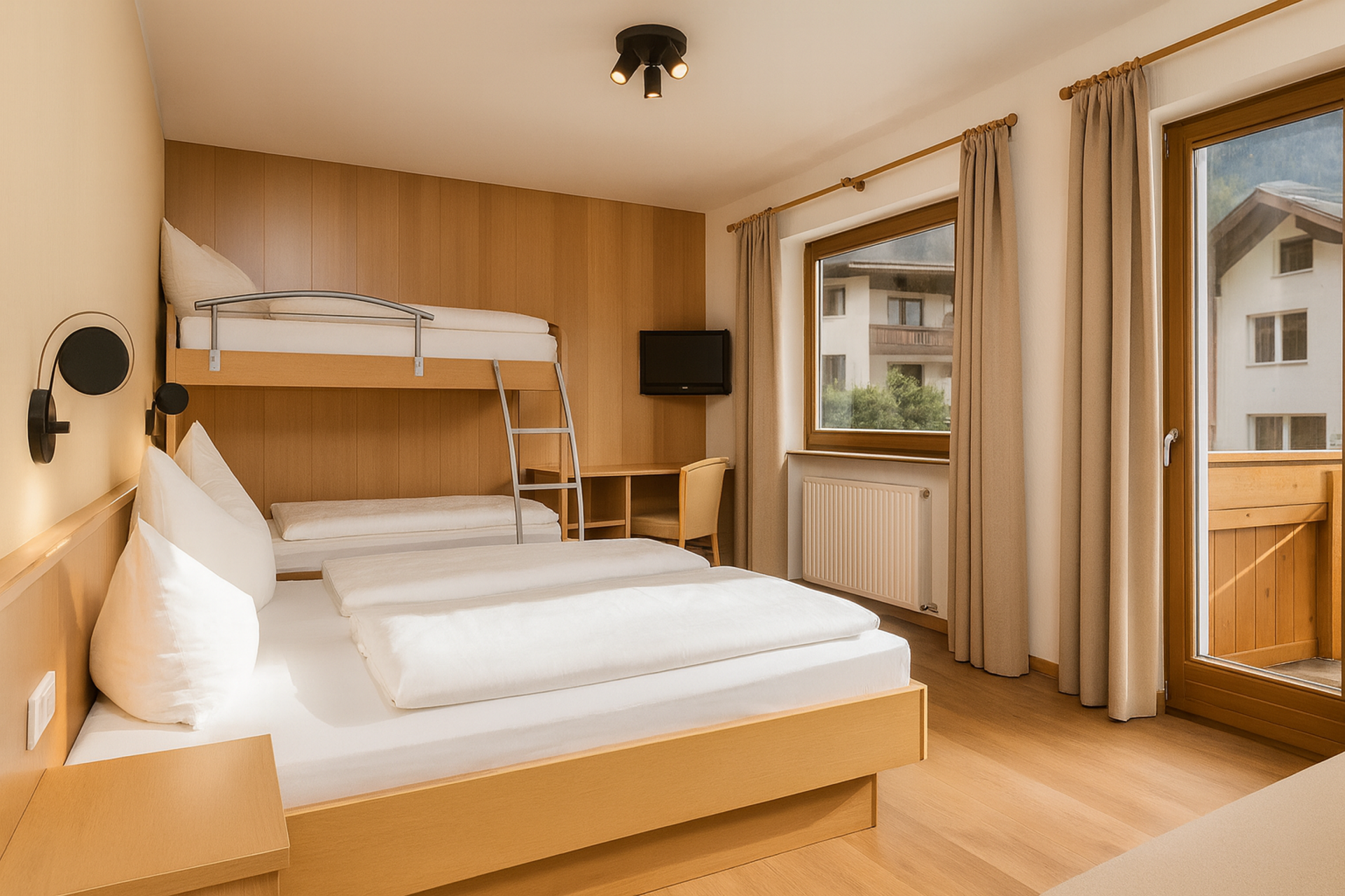 Comfortable quadruple room with spacious double bed and bunk bed (also suitable for adults), writing desk, sat TV, safe and bathroom with shower and toilet, wooden floor and balcony.